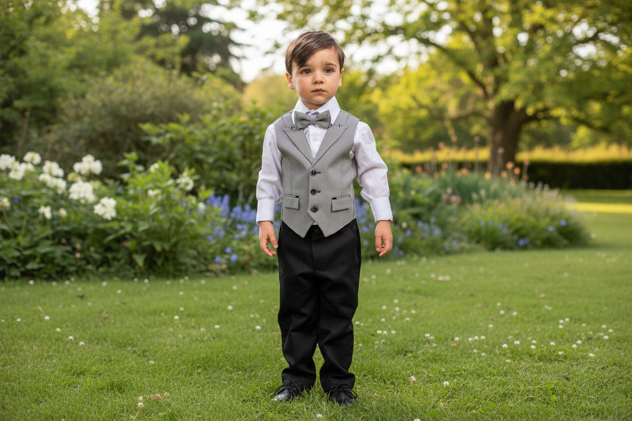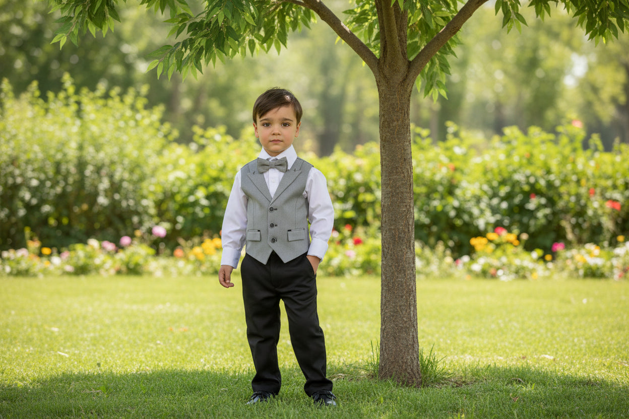 Designed for the discerning young man, the Preppy Moe Formal Boys Suit combines timeless elegance with practical comfort. This comprehensive four-piece collection includes a tailored knit cotton vest, matching cotton shirt, slim-fit trousers with flexible waistband sizing, and a coordinating bowtie—everything needed for weddings, pageants, and formal events. Built from quality cotton materials, this ensemble provides the refined aesthetic and durability expected for special occasions and repeated wear.