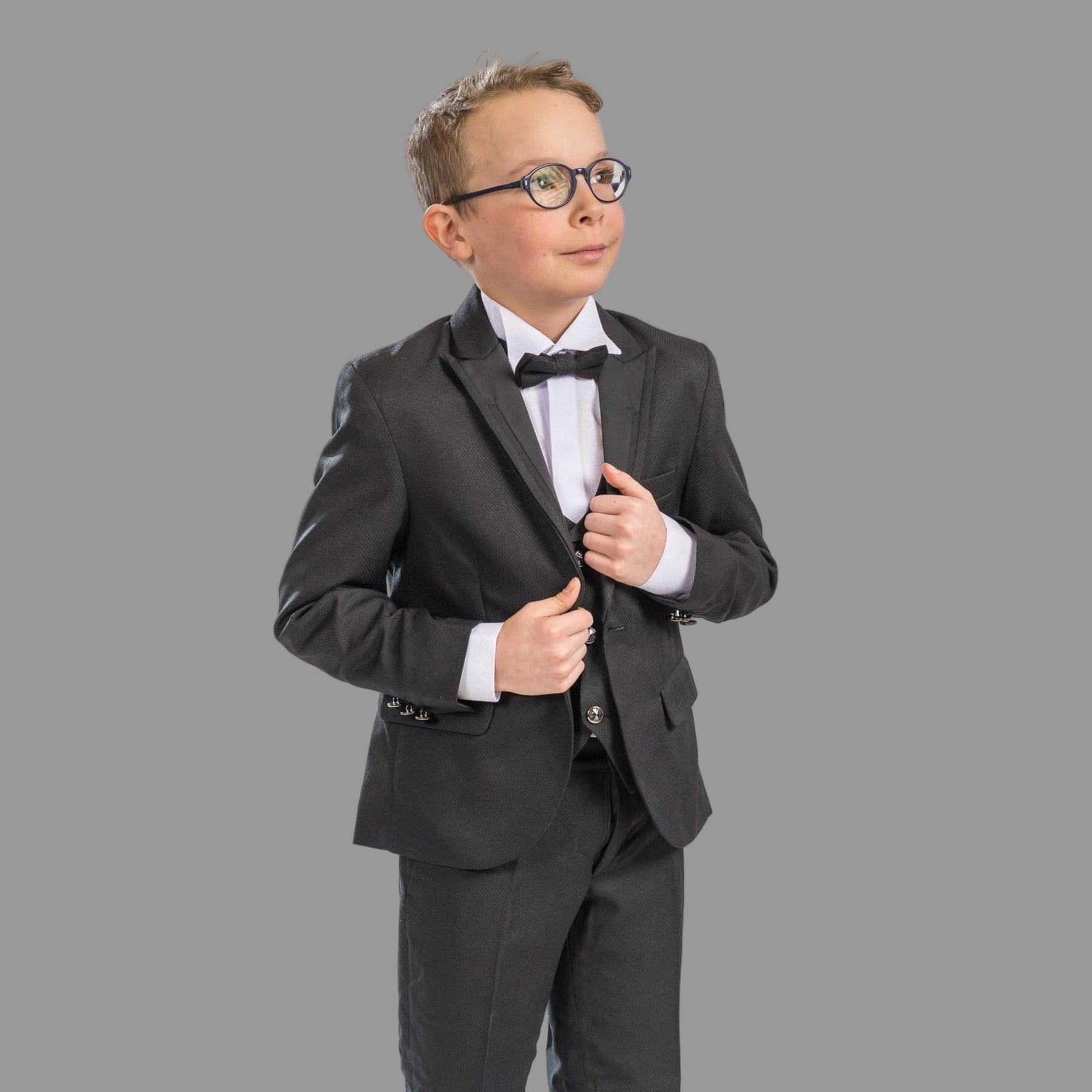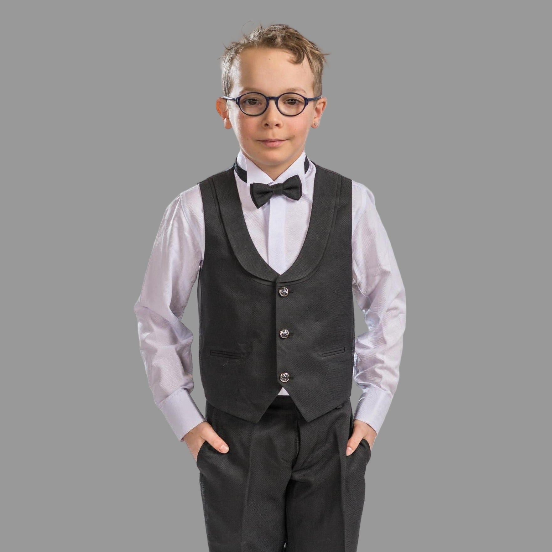 Elevate your young gentleman's formal wardrobe with the Senior Rafael Formal Boys Suit—a European-inspired ensemble designed for timeless elegance. This expertly tailored suit features a slim-fit blazer and adjustable-waist pants in a premium polyester-viscose blend, paired with a structured U-shaped vest and patterned cotton-blend tuxedo shirt for refined sophistication. The included bowtie adds the perfect finishing touch. Ideal for weddings, galas, and milestone celebrations, this exclusive design combines sharp styling with all-day comfort, ensuring your son looks confident and polished at every special occasion.