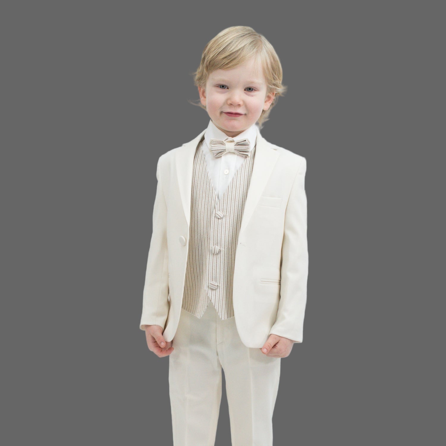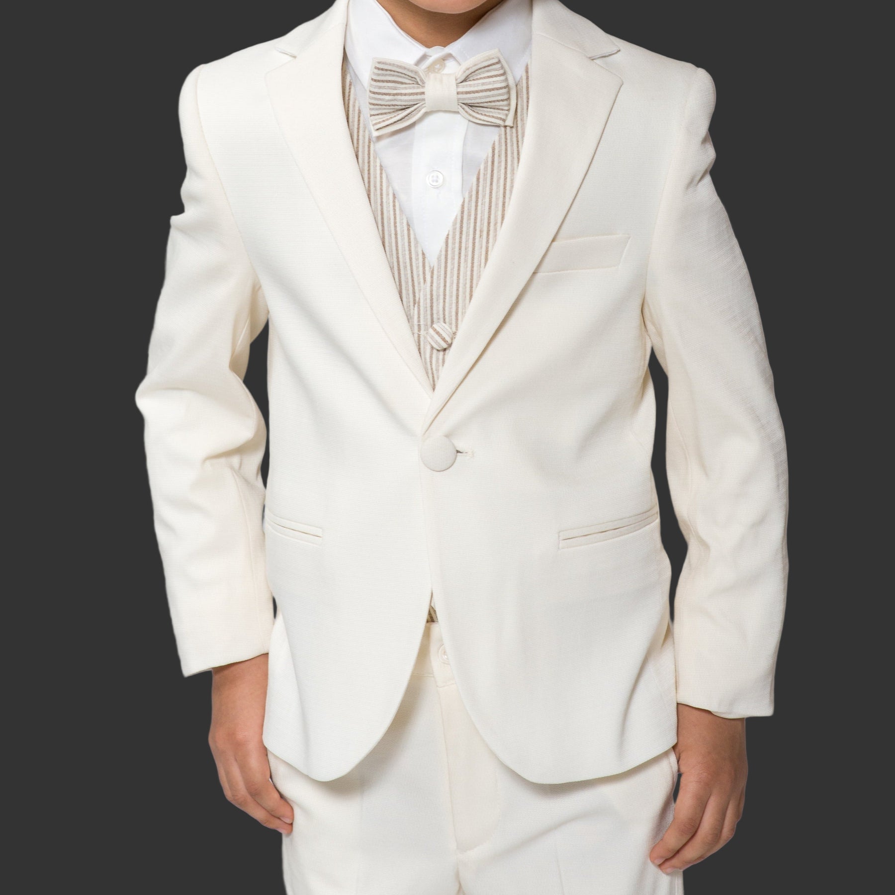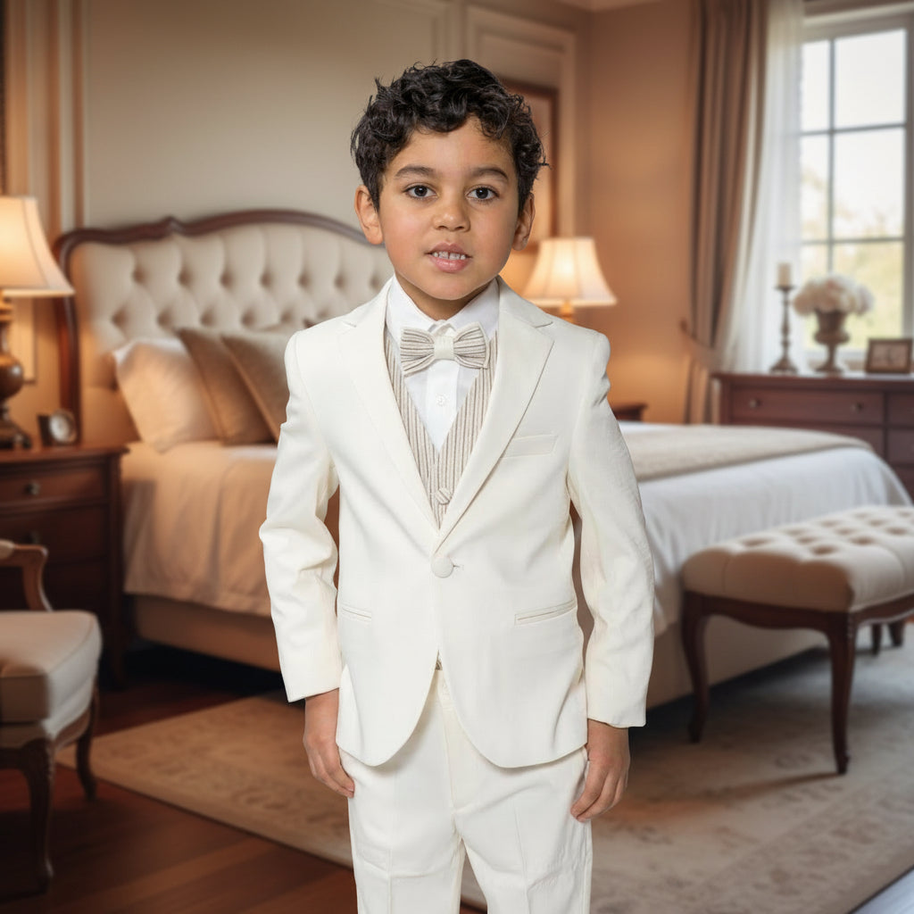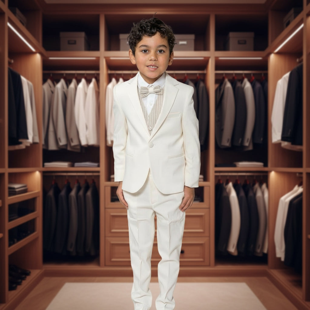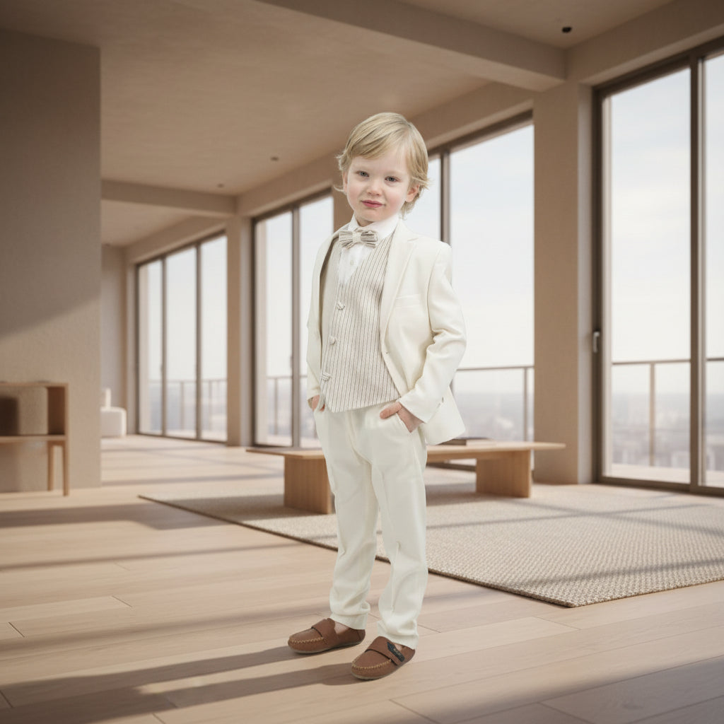 Introduce your child to timeless elegance with the Tuscany Dream Formal Boys Suit, a complete white ensemble designed for young gentlemen who deserve to make an impression. This sophisticated set features a tailored cotton blazer with a slim-fit silhouette, a striped sleeveless vest for added dimension, a crisp breathable cotton shirt, and adjustable-waist dress pants that grow with your child. The coordinating bowtie completes the polished look perfectly. Crafted from premium, soft cotton that's machine washable and wrinkle-resistant, this suit combines comfort with style for weddings, graduations, family celebrations, and every milestone moment in between. The adjustable waistband ensures a perfect fit through multiple occasions, while the contemporary tailoring keeps your child looking sharp and confident. Give your son the gift of refined style that he