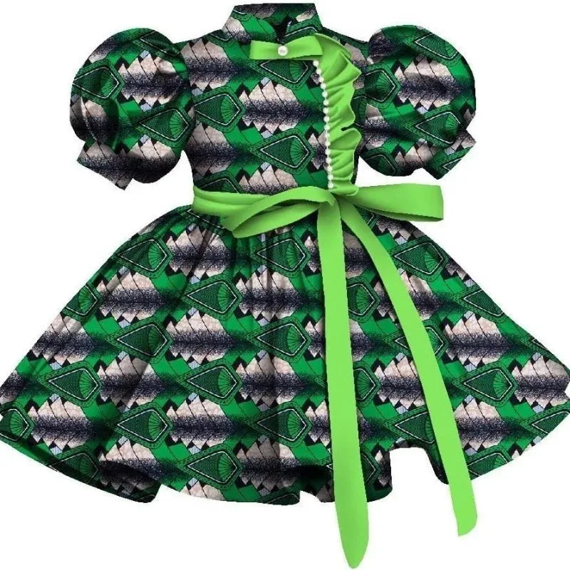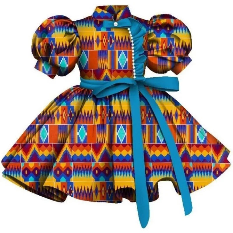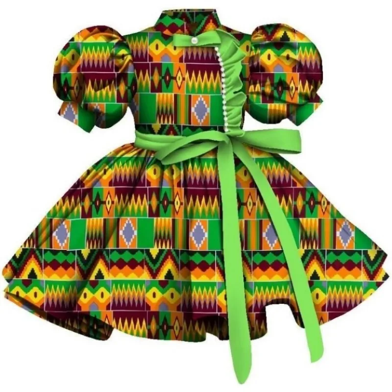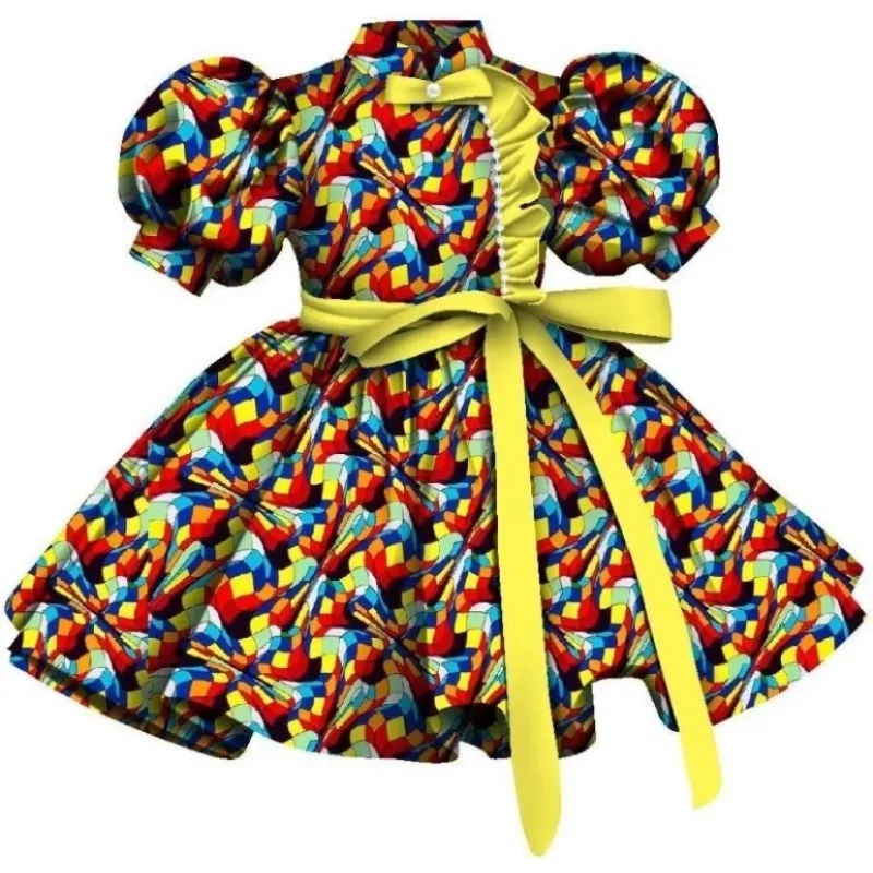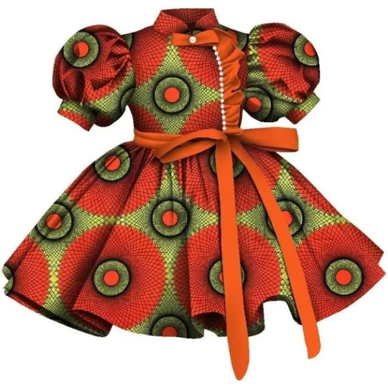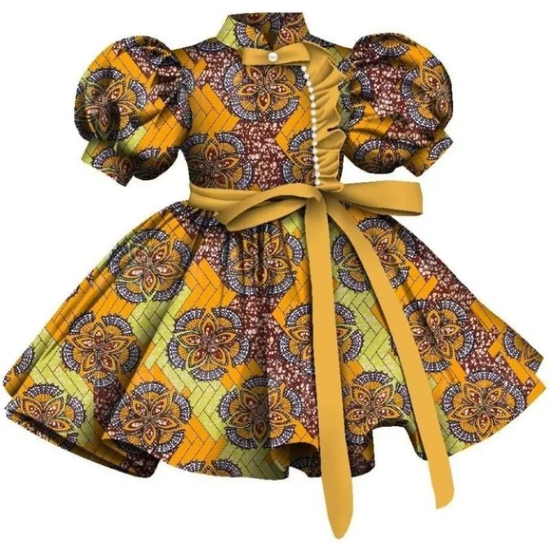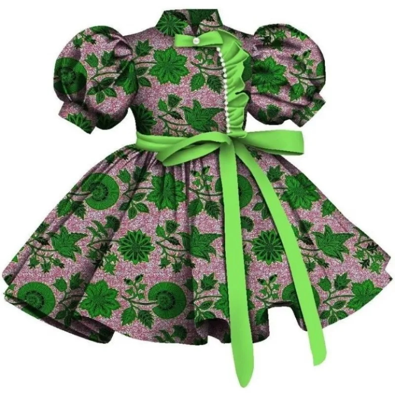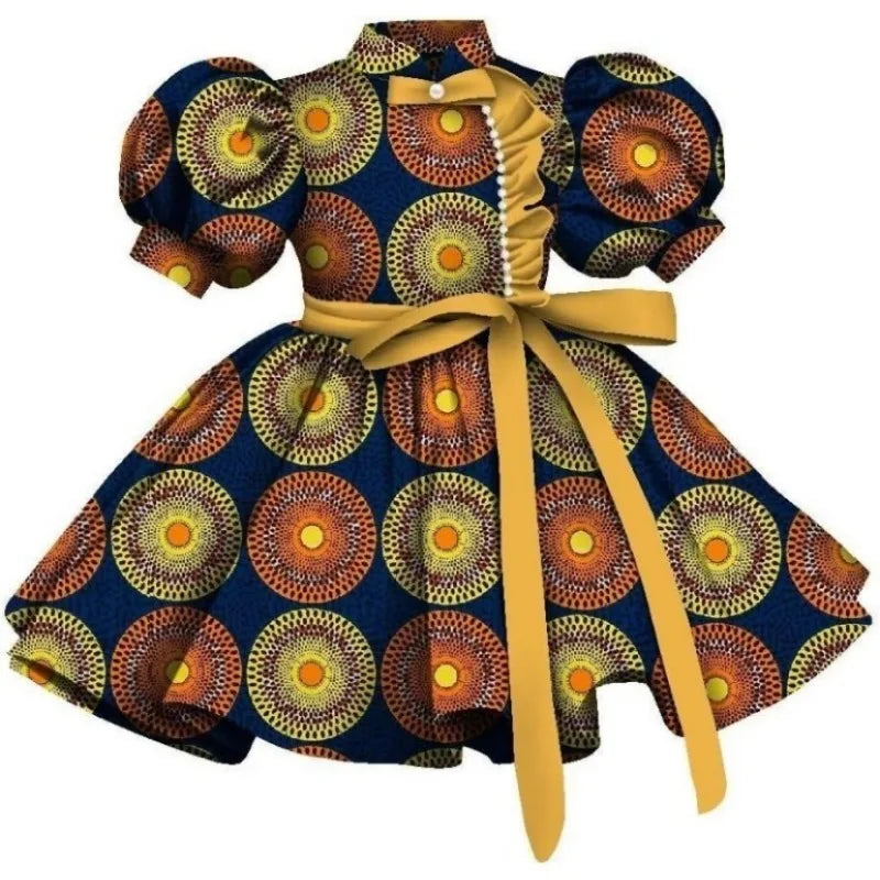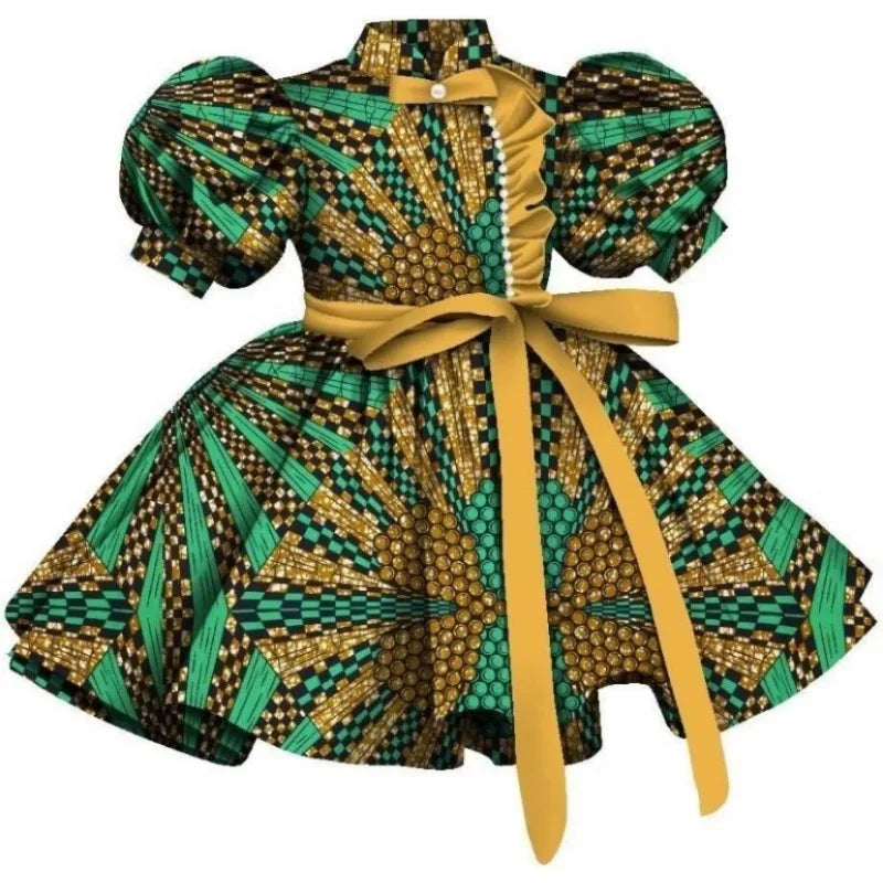 Elevate your daughter's wardrobe with this exquisite African cotton wax dress, expertly tailored with a high-waist silhouette and flowing A-line midi cut. Crafted from 100% premium African cotton, this piece features short sleeves and partial lining for refined comfort at weddings, celebrations, and formal events. Each dress is custom-made to ensure a perfect fit. The fabric may experience minimal shrinkage (4-6%) after initial washing but returns to original dimensions with wear. Care for this heirloom piece with mild detergent or professional dry cleaning, avoiding bleach and ironing only when dry. Available for both retail and wholesale.