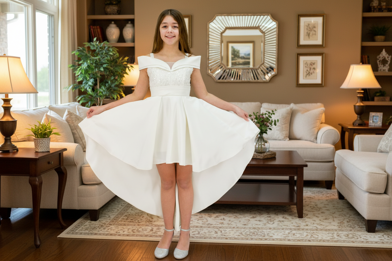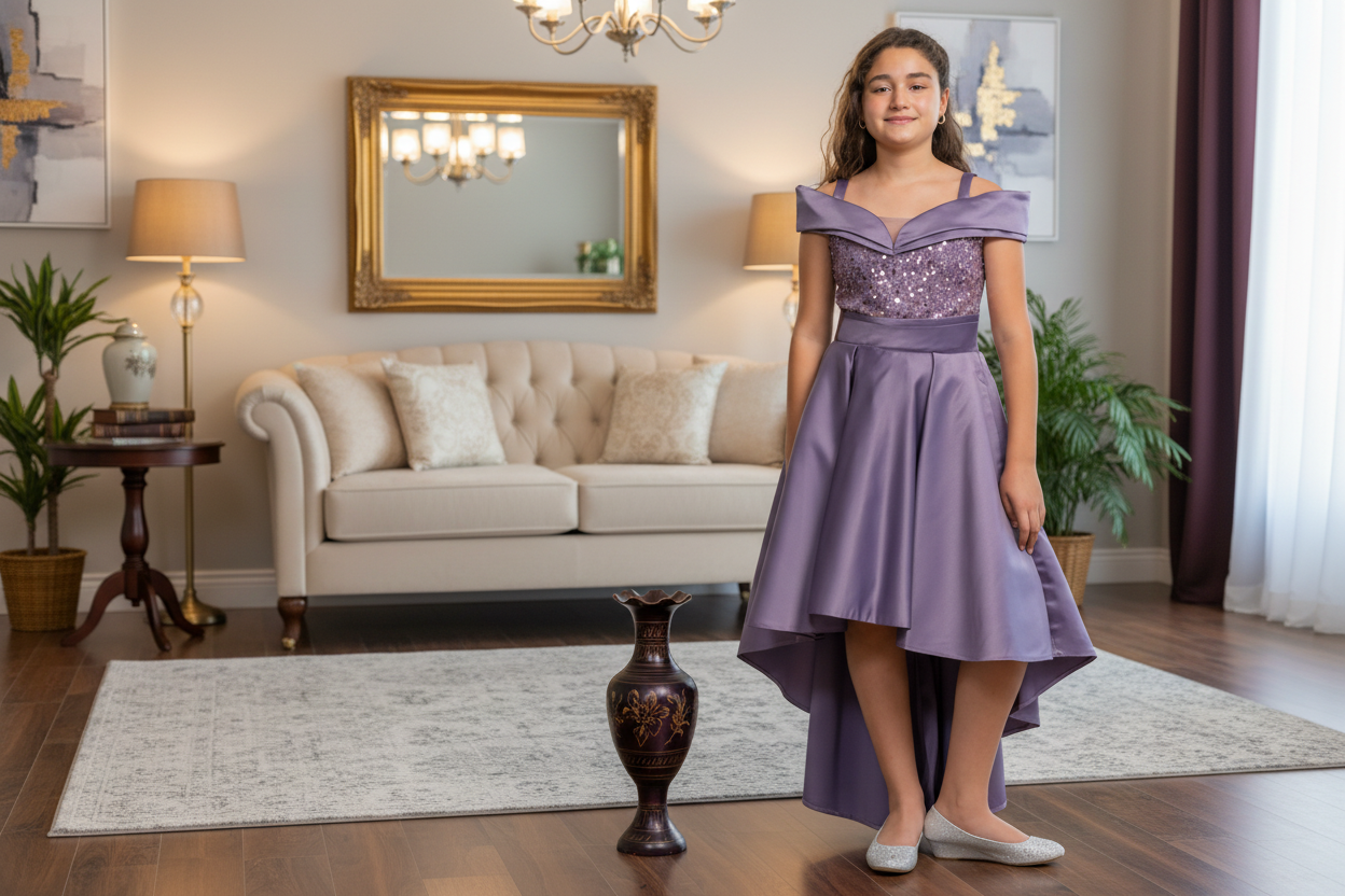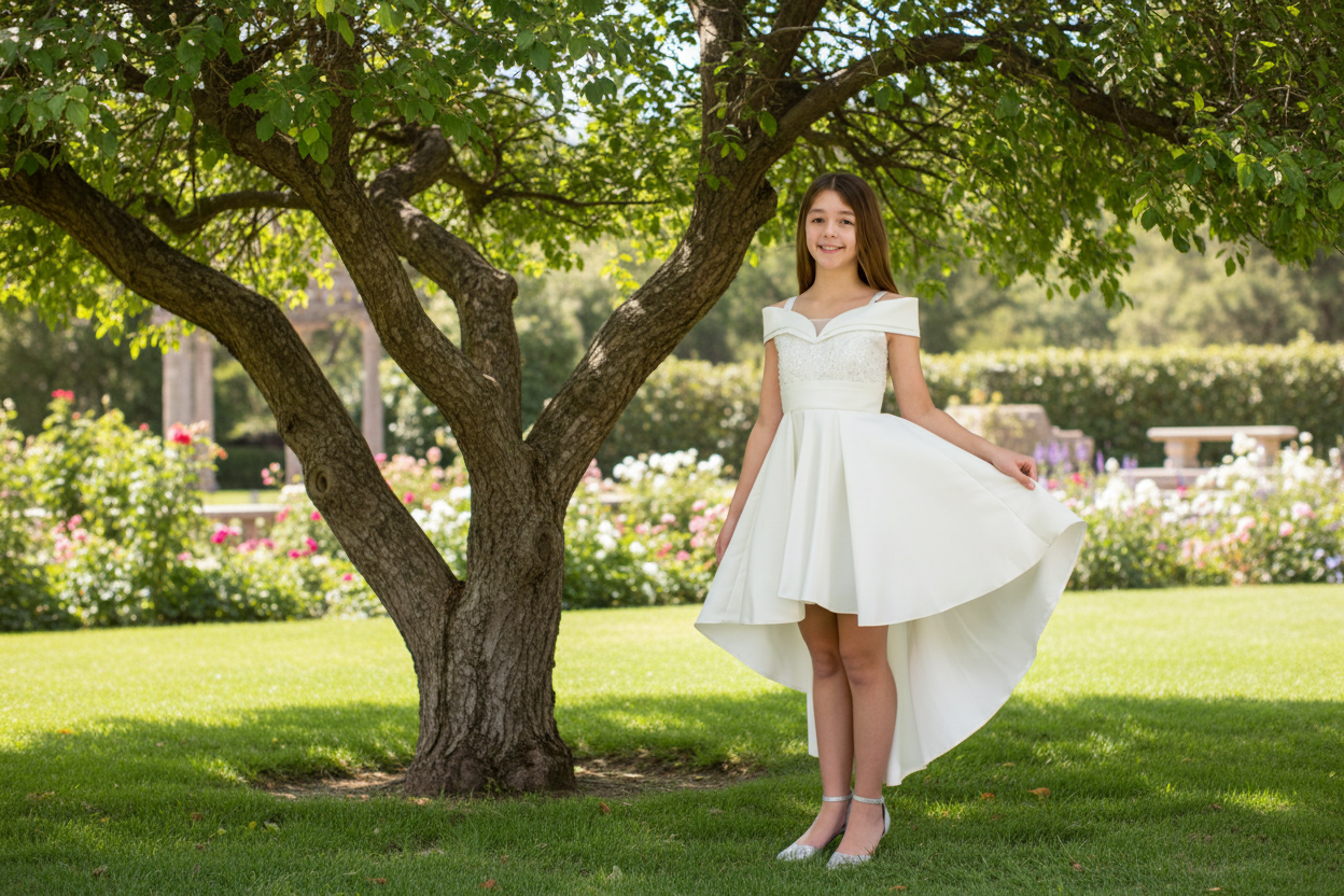 Enhance her elegance with our high-low satin dress tailored to suit your preteen's style. The bodice of the dress is adorned with lustrous pearls and sequins, introducing a hint of glamour. Our unique elastic back ensures a flawless fit every time, while the silky satin fabric amplifies the overall sophistication, making it an ideal choice for special occasions and events.