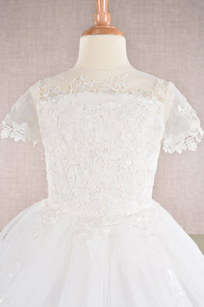 Floral Lace Embellished Bodice Short Sleeve Mesh Kids Dress with Cut-Out Back