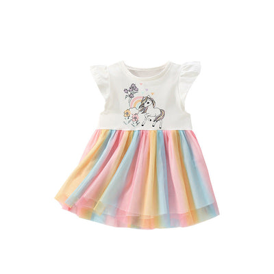 Summer Arrival Animals and Flowers Cartoon Pattern Fly Sleeves Tulle Patchwork Dress for Stylish Girls