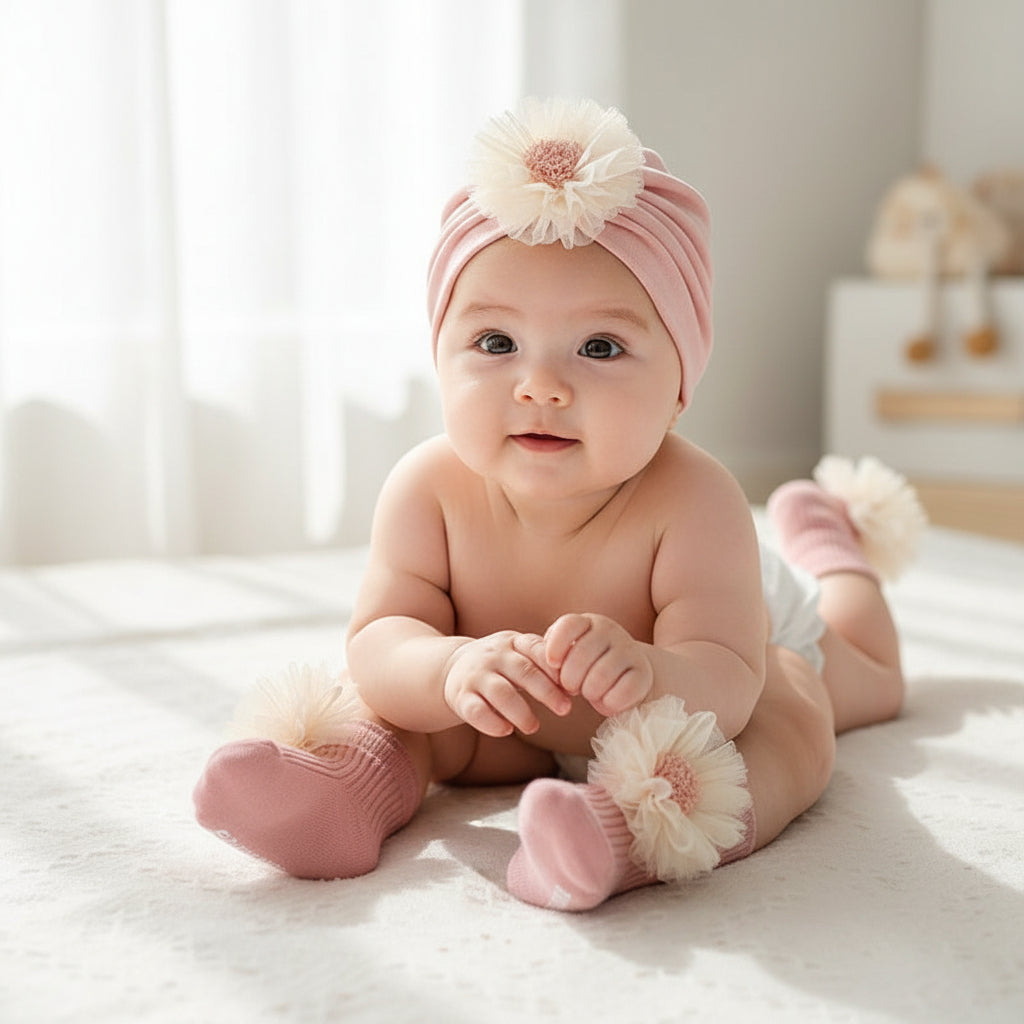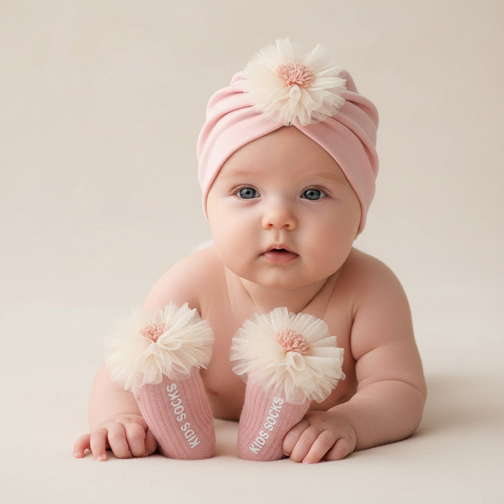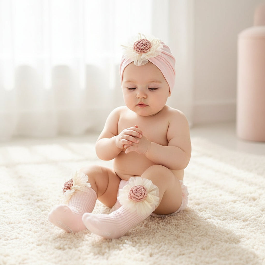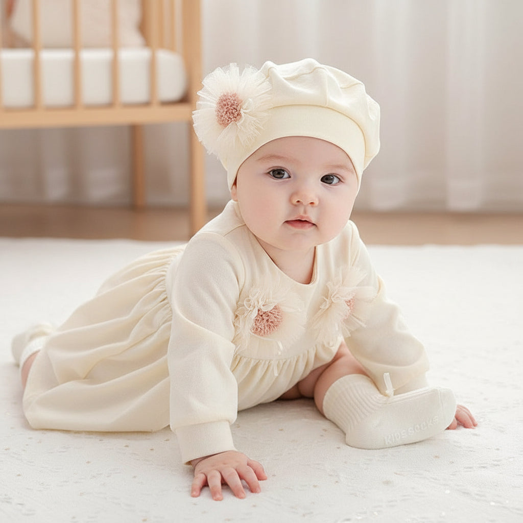 . Celebrate every milestone with this adorable three-piece baby set designed for your little princess! Crafted from soft, breathable combed cotton, this charming collection features a cozy beanie cap, matching socks, and a delicate lace flower suit that's perfect for special occasions or everyday wear. Available in elegant beige and pretty pink options, with lightweight spring-summer versions for year-round comfort. The dome-style crown adds an extra touch of sweetness to the beanie, while the premium cotton blend keeps your baby comfortable whether she's celebrating her first smiles or her first birthday. Ideal for newborns through 2-year-olds, this coordinated set makes dressing your little one effortless and Instagram-worthy. Perfect for photo sessions, family gatherings, or just because moments that deserve a touch of elegance and charm