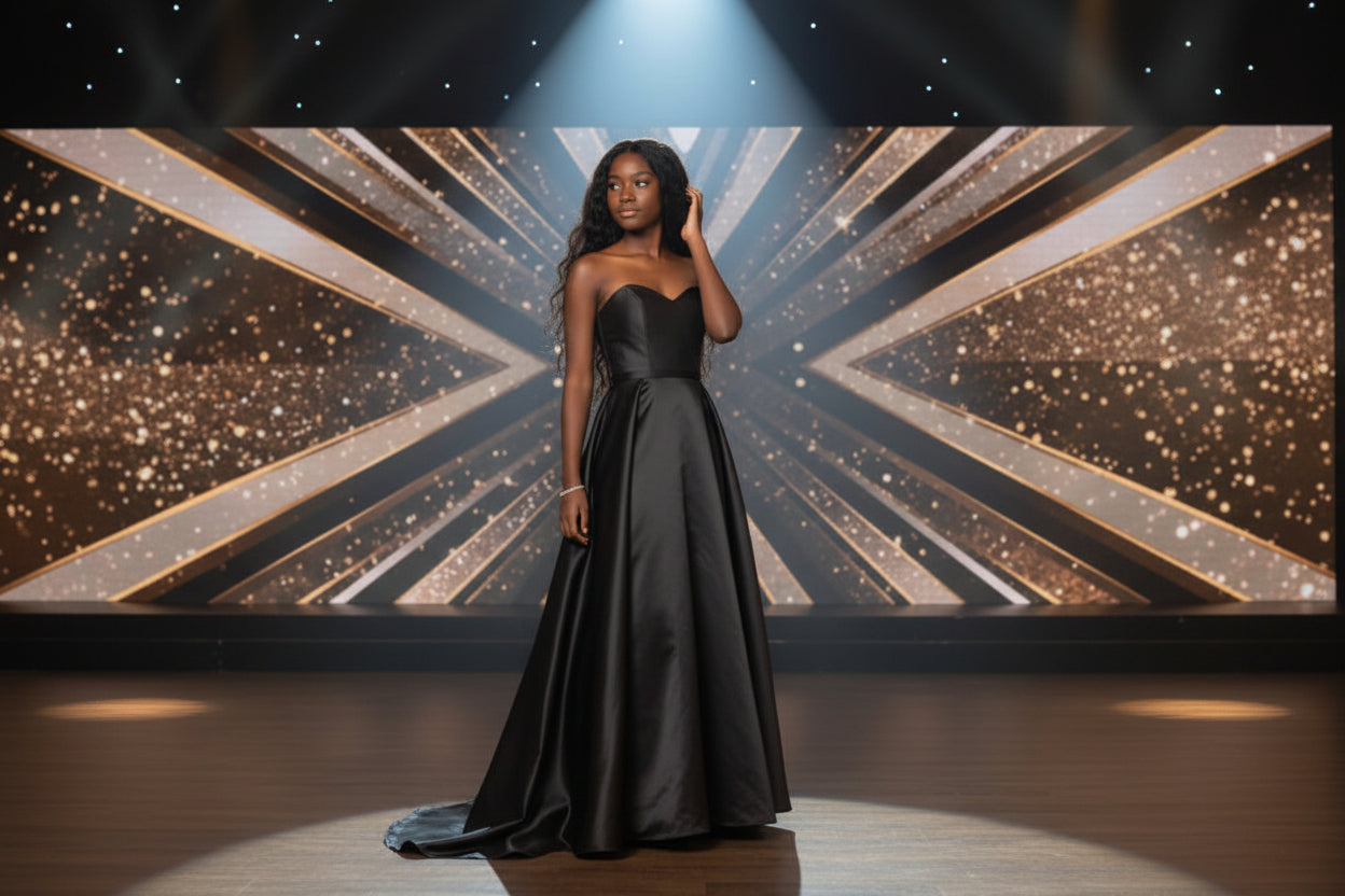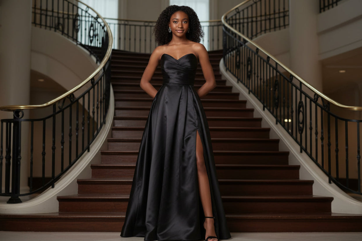 Elevate any formal occasion with this stunning black ball gown from Dylan and Davids. The sweetheart neckline and strapless corset bodice create a refined silhouette that flatters and defines the waist. Constructed from luxurious satin, the dramatic A-line skirt flows with timeless elegance, making it an ideal choice for prom, galas, and sophisticated celebrations. This full-length gown delivers the polished, graceful presence expected at high-profile events.
