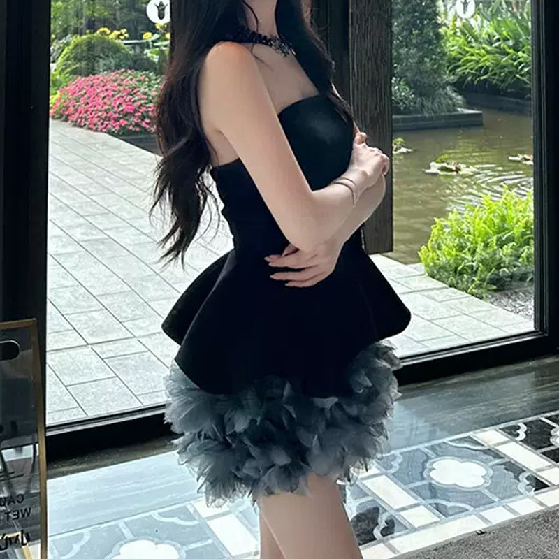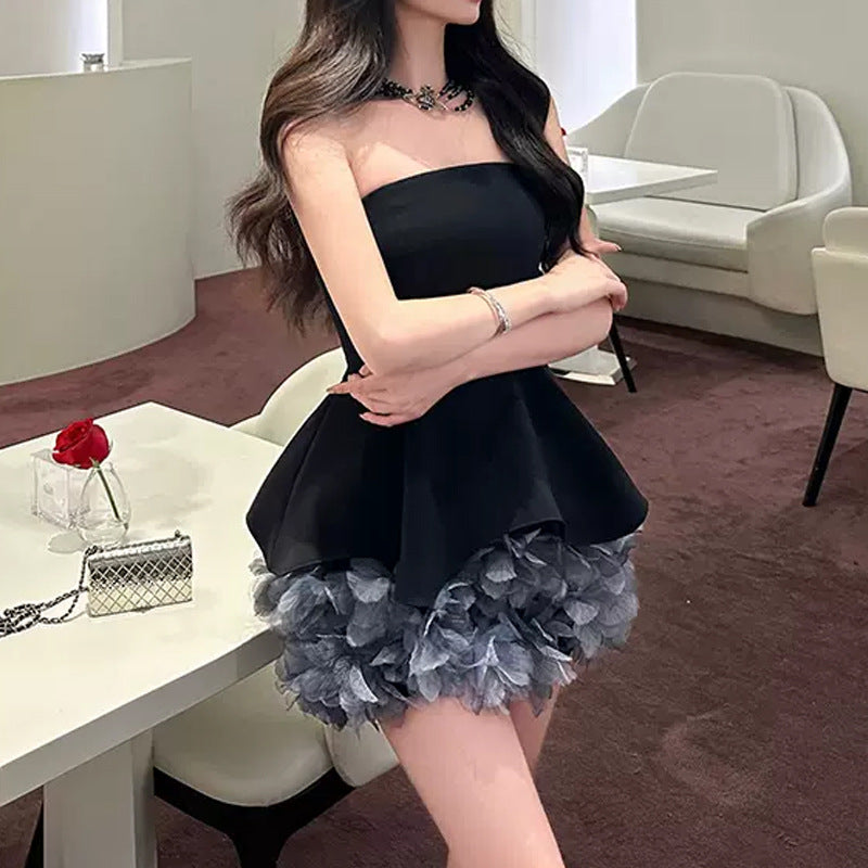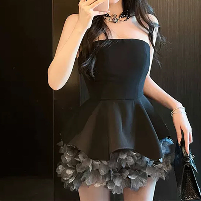 This striking strapless dress combines artistic retro flair with modern sophistication. Featuring a high-waist silhouette and eye-catching tie-dyed three-dimensional flower hem detailing, it delivers a bold statement piece perfect for special occasions and pageant events. Crafted from durable polyester, the tube-top design offers a sleek, elegant look. Available in sizes S, M, and L. Note: Asian sizing runs 1–2 sizes smaller than US/European standards; we recommend sizing up if between sizes. Please review the size chart before purchasing, and allow for minor measurement variations. Colors may vary slightly from product images due to display differences. Includes one dress.