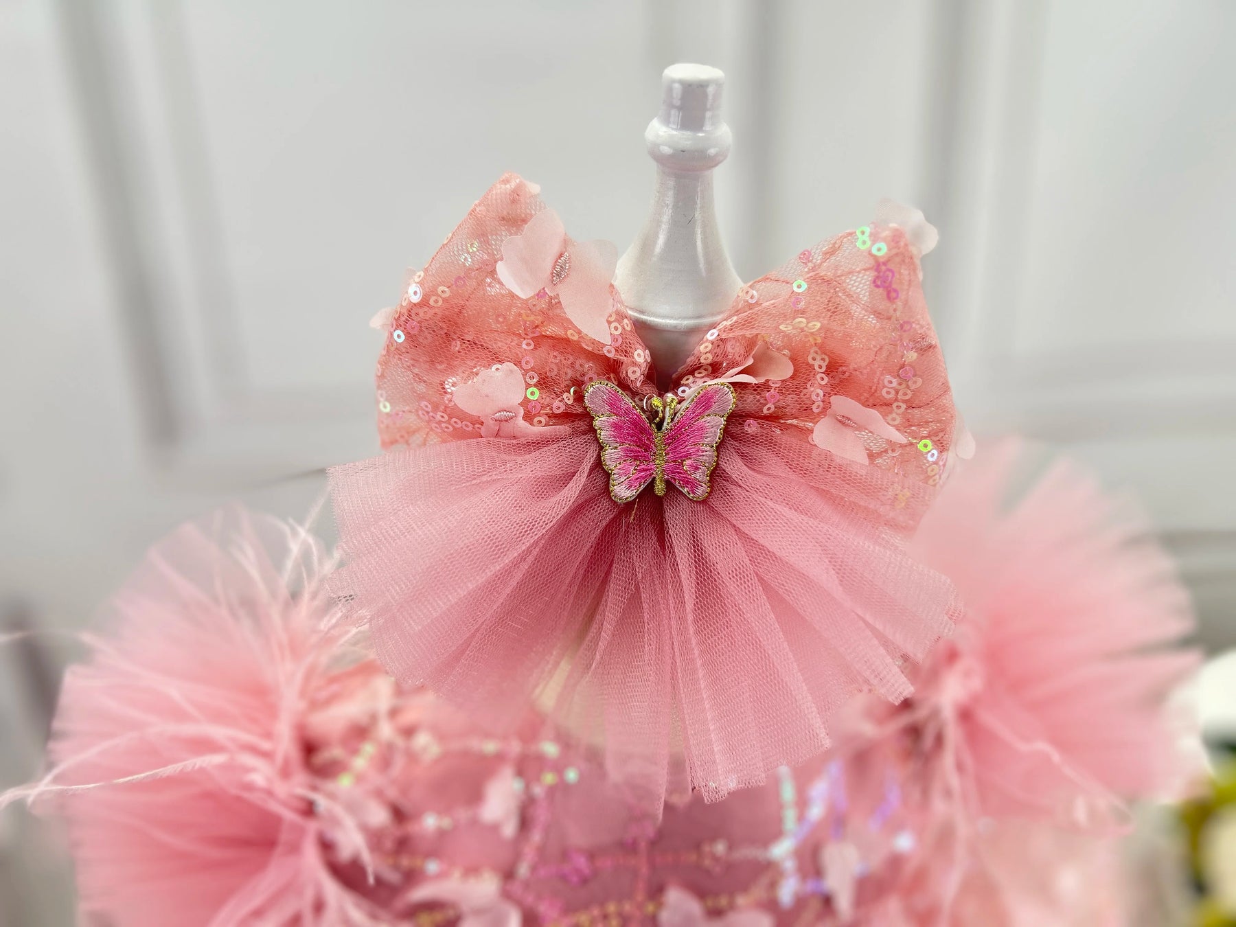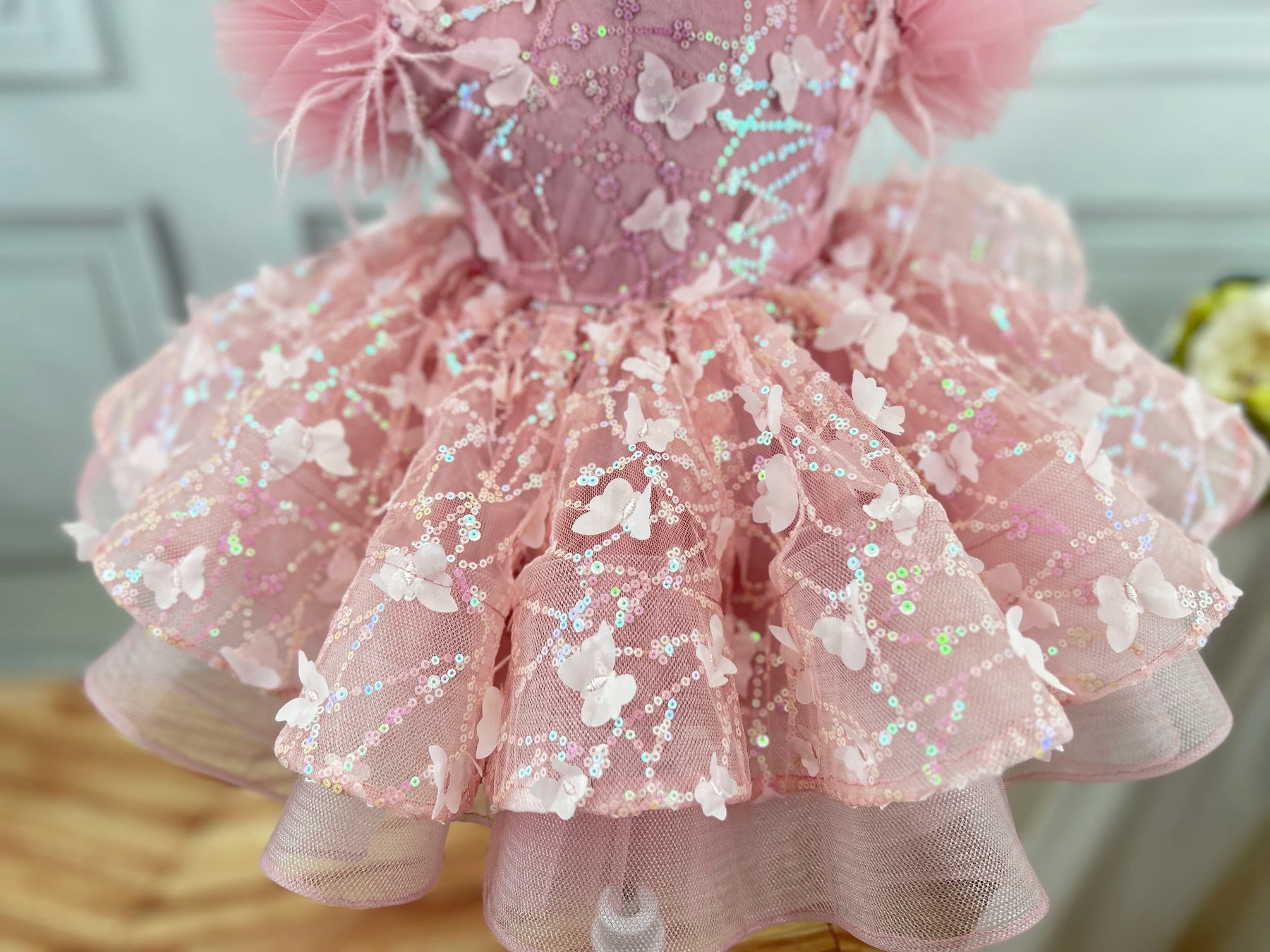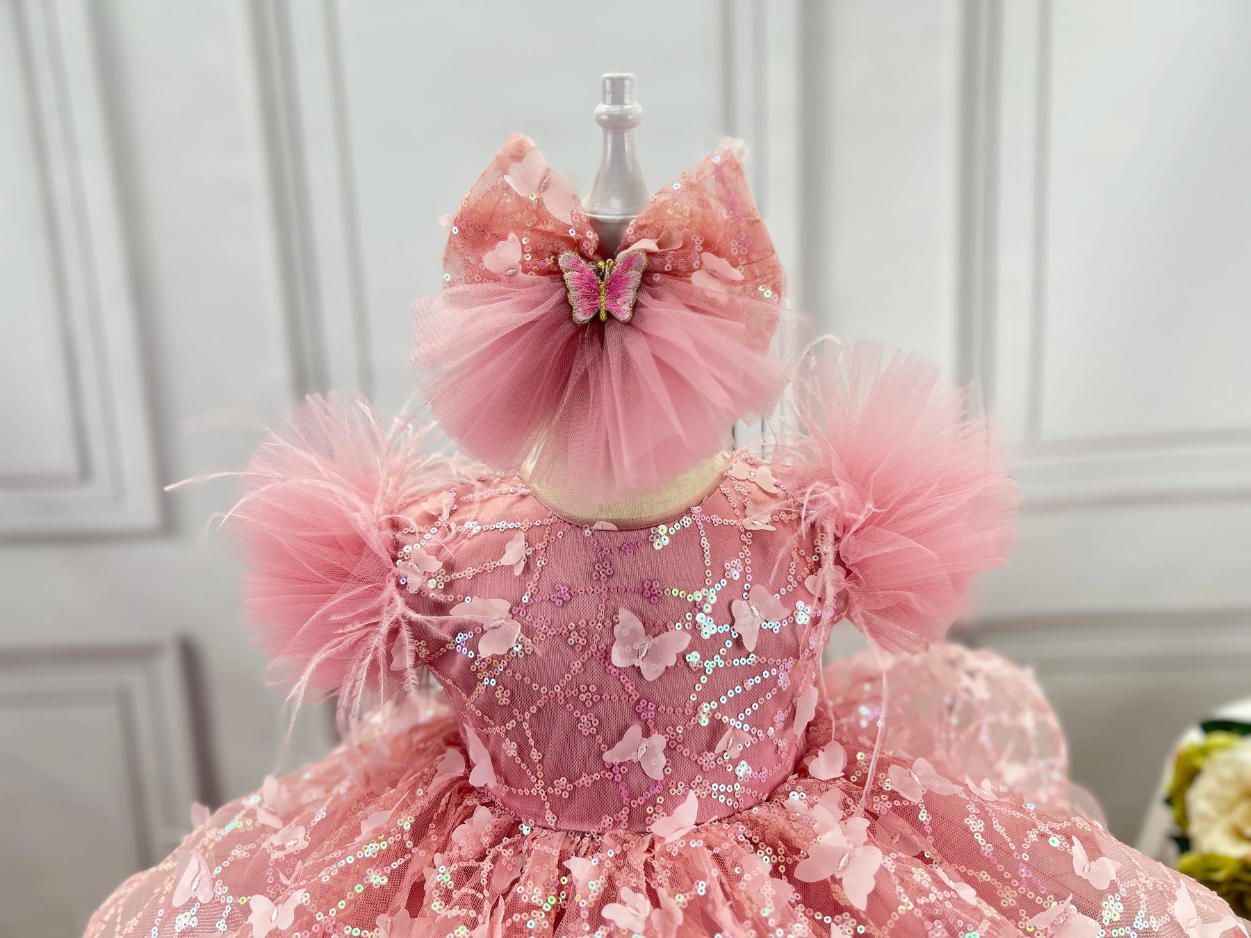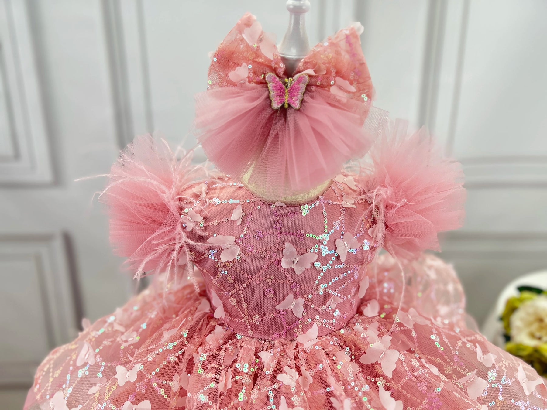 This stunning flower girl dress transforms any young lady into a vision of elegance and grace. Crafted with delicate butterfly embroidery and shimmering sequined lace, the dress captures attention with its bold, eye-catching design. Perfect for pageants, formal celebrations, or special birthday moments, it combines sophistication with playful charm. The intricate detailing and premium construction ensure your little one feels confident and radiant. Whether she's walking down the aisle or commanding the stage, this dress makes an unforgettable statement that celebrates her beauty and individuality.