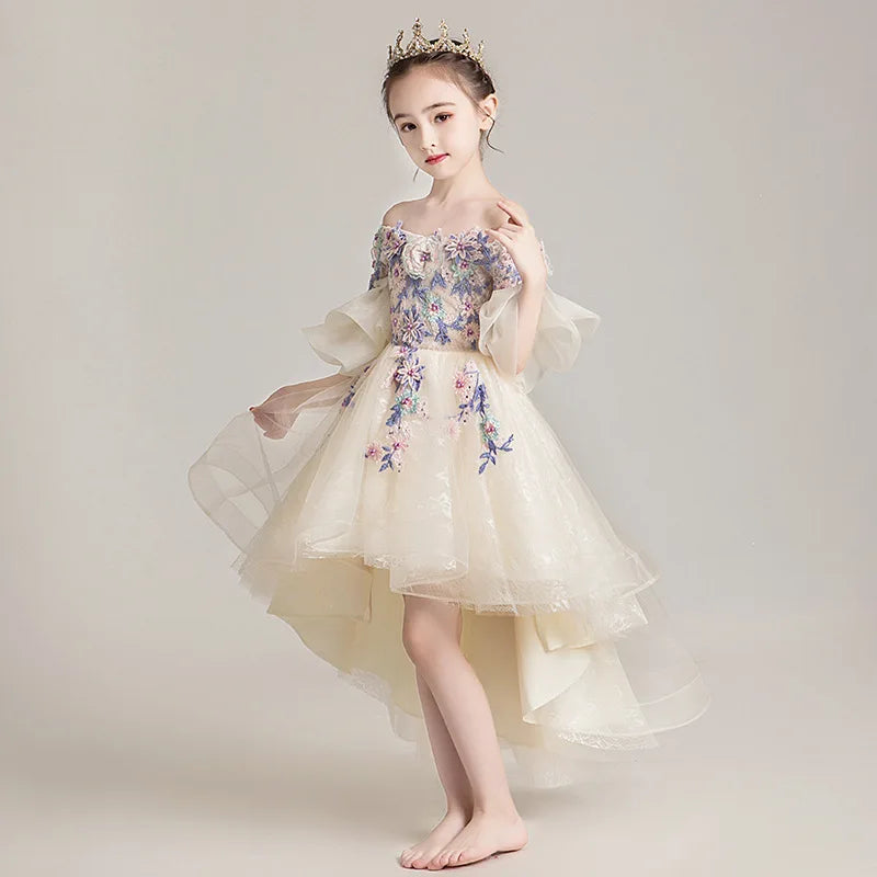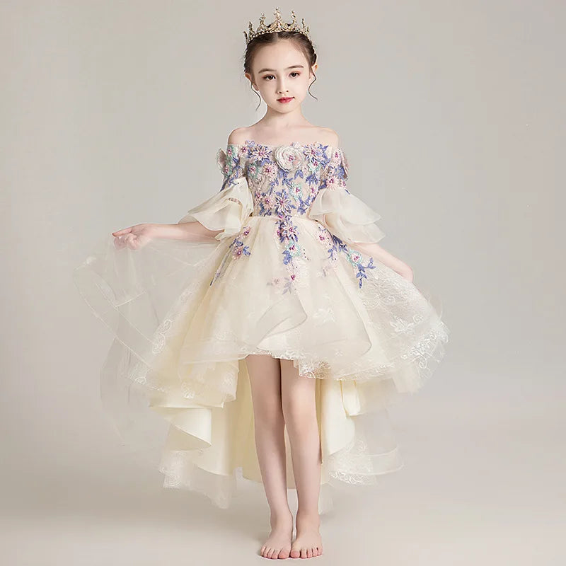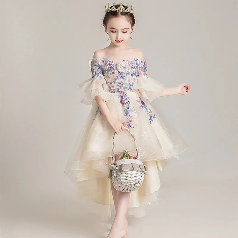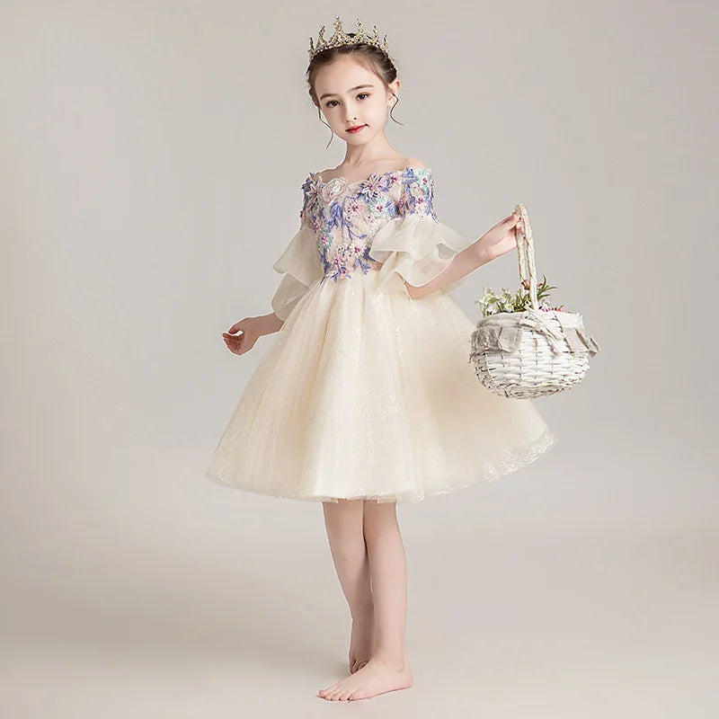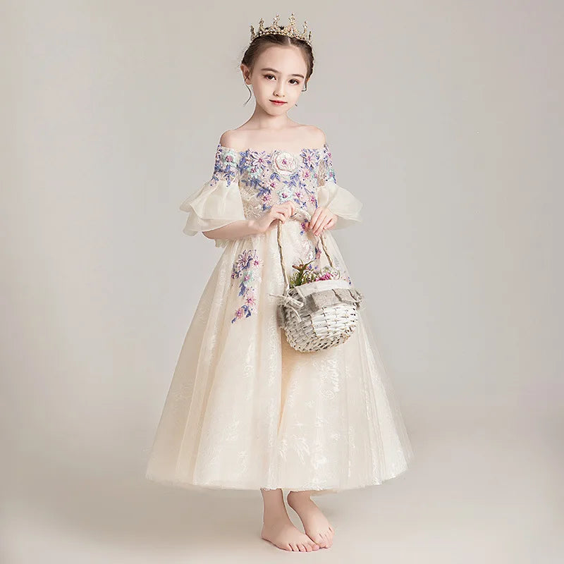 Designed for girls ages 7-13, this exquisite Teenmiro ball gown combines timeless elegance with youthful charm. Featuring a graceful shoulderless neckline and delicate half sleeves with a charming flare, the dress showcases intricate beading and a romantic floral pattern. Crafted from quality polyester with a classic knee-length silhouette, this summer gown is tailored true to size for an impeccable fit. Ideal for flower girls, pageants, and formal celebrations, it delivers sophisticated style with an endearing, age-appropriate design that makes every special occasion memorable.