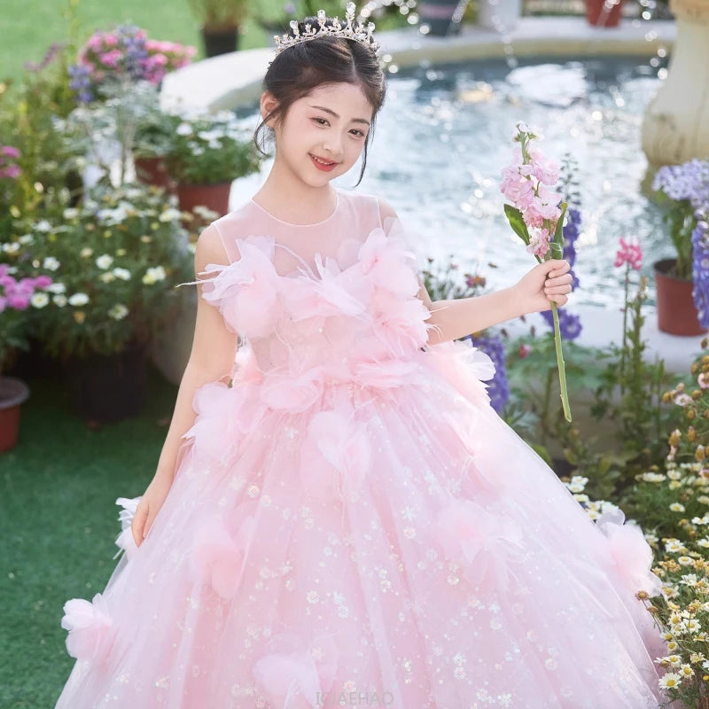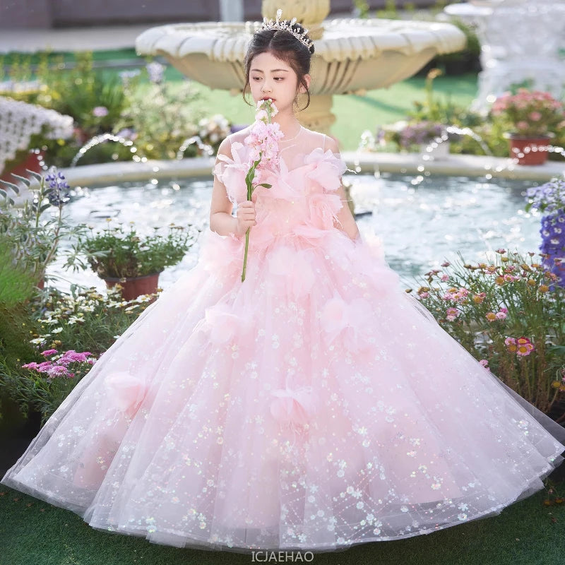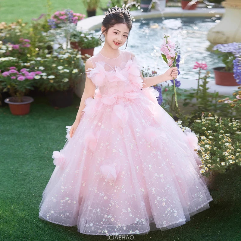 Pink Girls Princess Dress Birthday Party Pageant Gown Fashion Costume Kids Piano Recital Performance Outfit Children Clothes