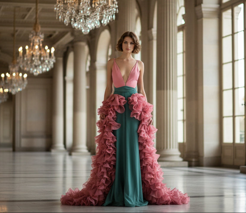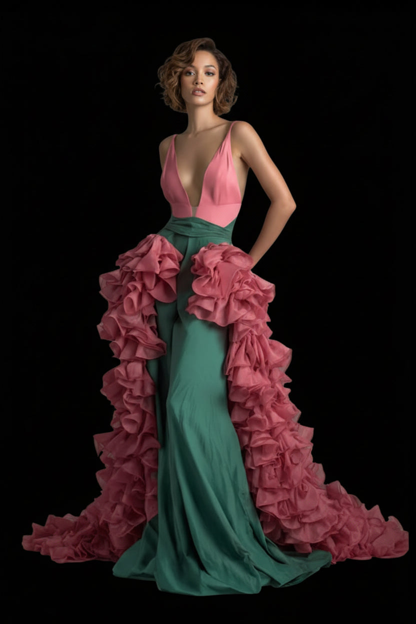 Make a statement at every formal event with this expertly crafted two-tone gown. The plunging deep V neckline commands attention while maintaining sophistication, complemented by striking color contrast that flatters diverse skin tones. The standout feature—a detachable cascading ruffle train—offers styling flexibility: dramatic and show-stopping for pageants and galas, or streamlined for receptions and dinners. Built with quality construction to withstand the demands of young event-goers, this gown transitions seamlessly from red-carpet moments to intimate celebrations.