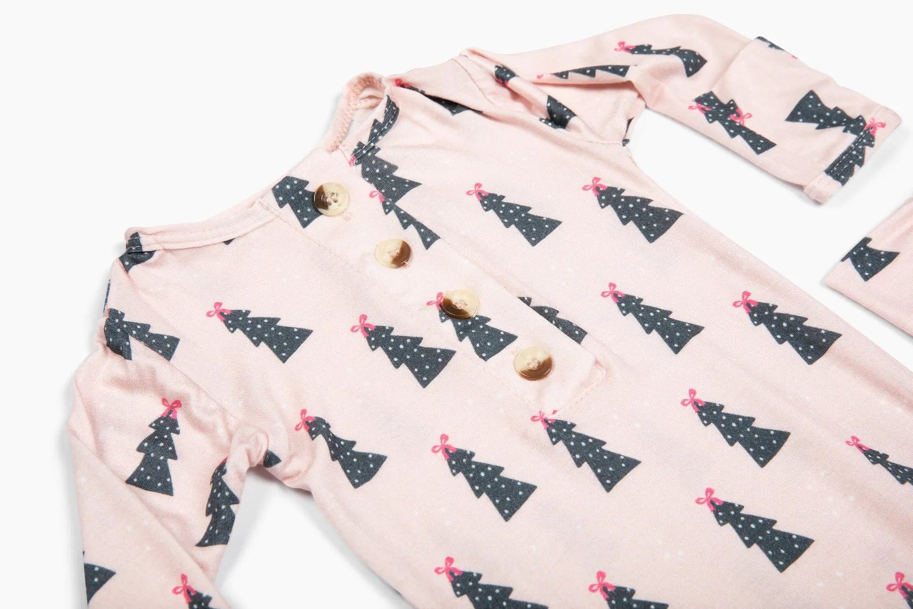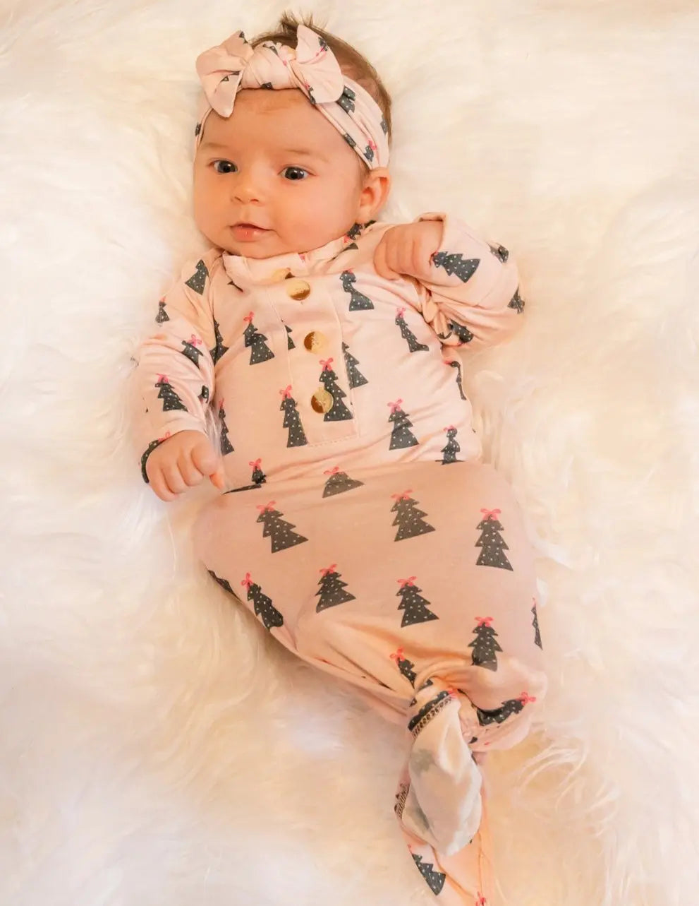 Our Newborn Baby Gown Sets are made of a buttery soft Modal/Spandex blend. The ultra-soft baby gown features built-in no-scratch mittens to protect your baby’s delicate face from fingernail scratches. The working buttons allow you to easily pull the gown over your baby’s head, and the knotted bottom of the gown makes diaper changes super easy! This set is ideal for ages newborn to 3 months old and is the perfect Christmas outfit to keep your little one cozy and festive.